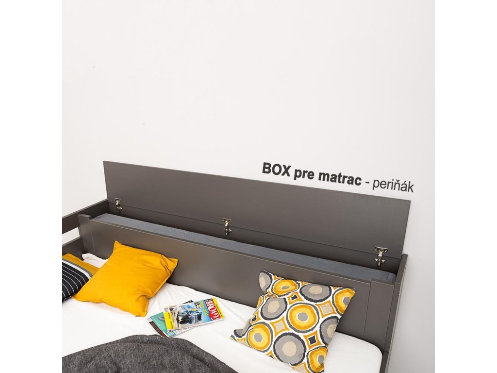 - korpus postele je doplněný o peřiňák na odložení druhé matrace (šířka prostoru je cca 25cm, ale kvůli závěsům víka, je použitelná průchozí šířka pro uložení matrace tloušťky cca 20cm)