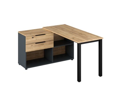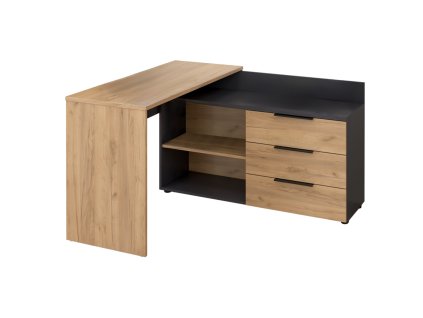 - Rohový PC stůl, který disponuje úložným prostorem v podobě třech šuplíků a dvou polic, stůl je universální, úložnou část tak může mít na pravé nebo levé stzraně
