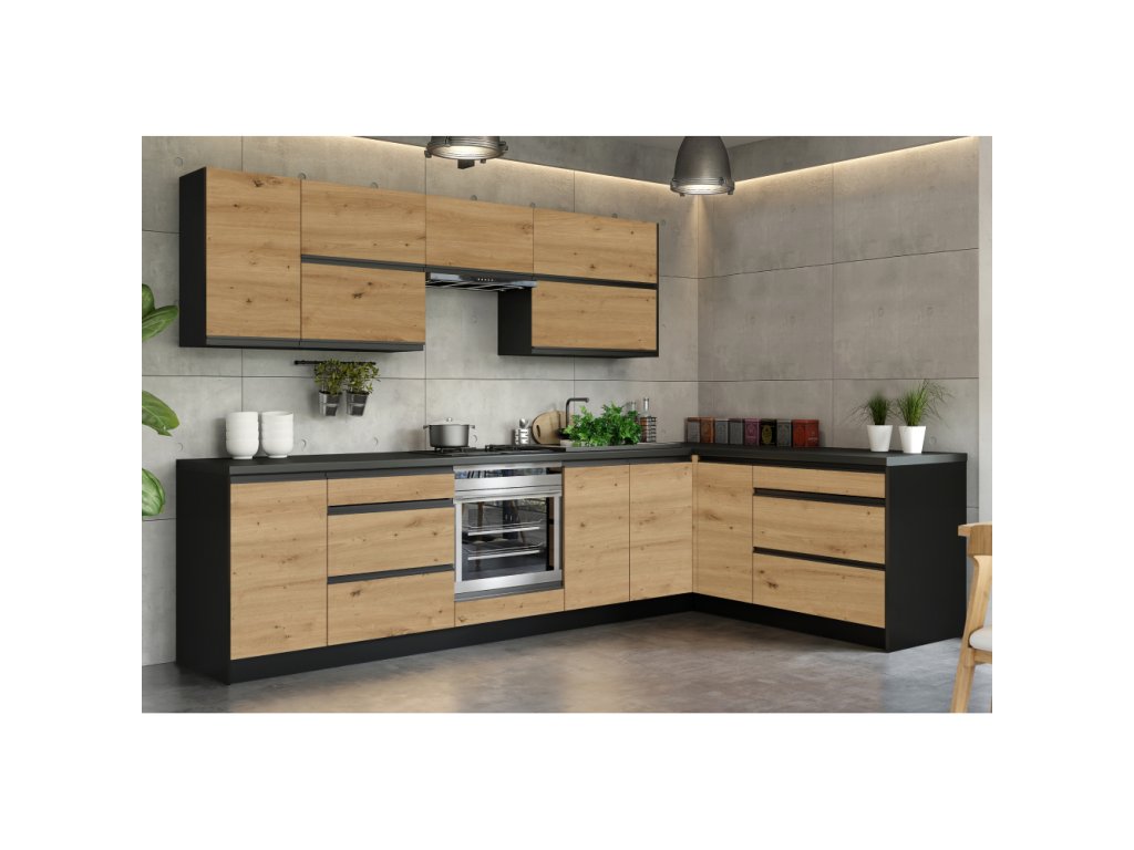 Rohová universální kuchyňská linka BRECK,300x180, dub artisan/černá