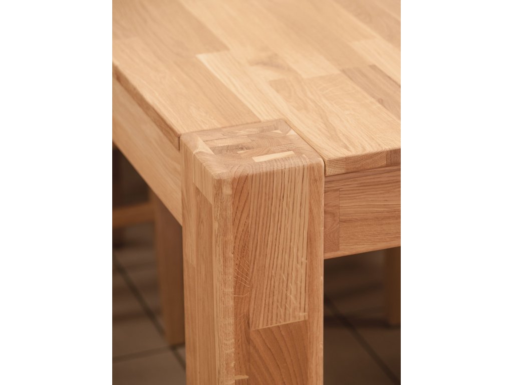 Jídelní stůl z dubového masivu. Konstrukce s nohami přiznanými v rozích. Deska je vyrobena technologií "cink spárovka" - vynikne tak odstínová rozmanitost materiálu dub masiv.Doplňkové parametry