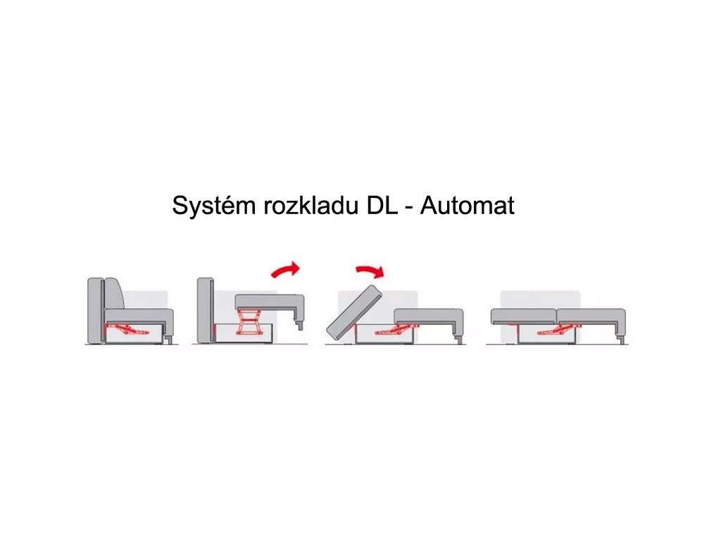 - pohovka má systém rozkladu "DL - Automat", pomocí kterého se sedák vysune nahoru a dopředu, opěradlo se sklopí na úložný prostor a vyplní tak mezeru ve spací ploše. Výhodou tohoto systému je, že po podlaze nic nejezdí a proto není nebezpečí poškození podlahy.