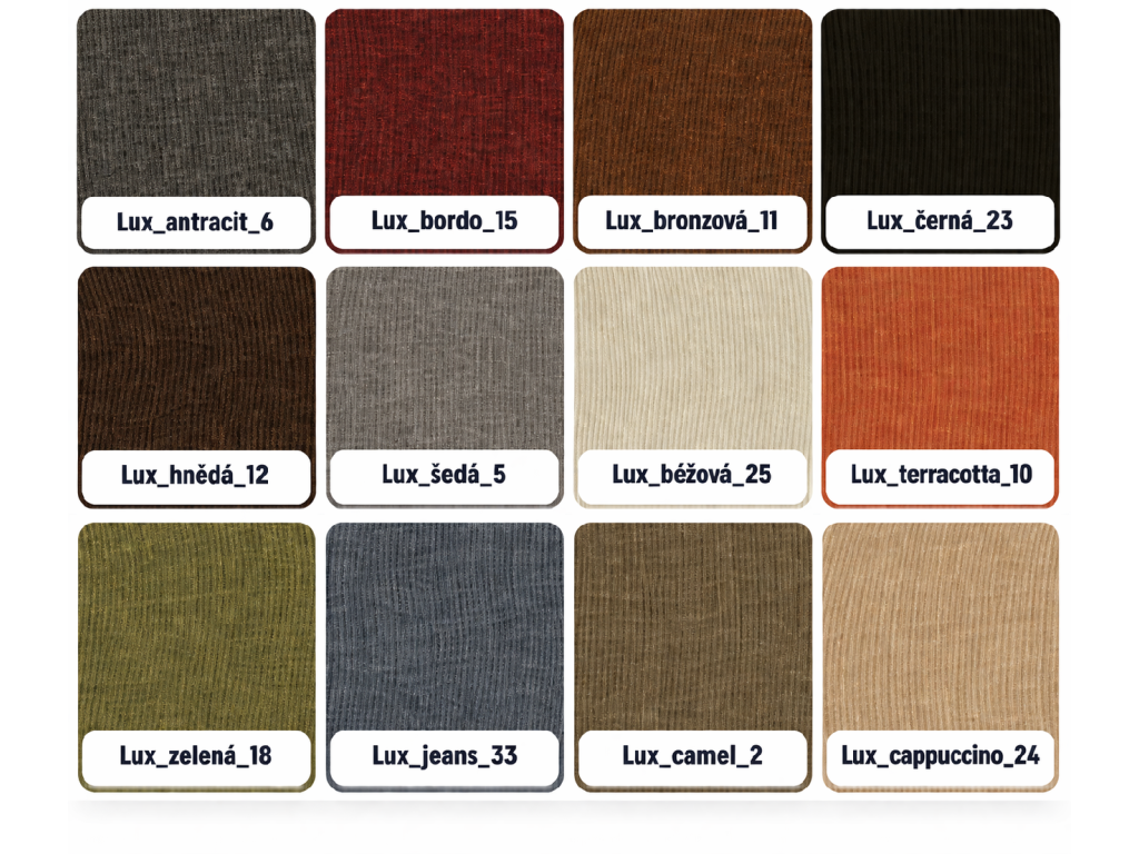 Kolekce LUX je moderní, jemně tkaná látka dostupná v široké škále oblíbených odstínů.