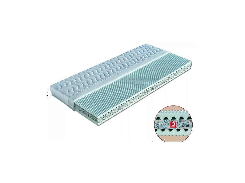 - Matrace je vyrobena z pevného polyuretanového pojeného jádra (PUR RE 80) a profilované pěny MediFoam (32 kg/m³).